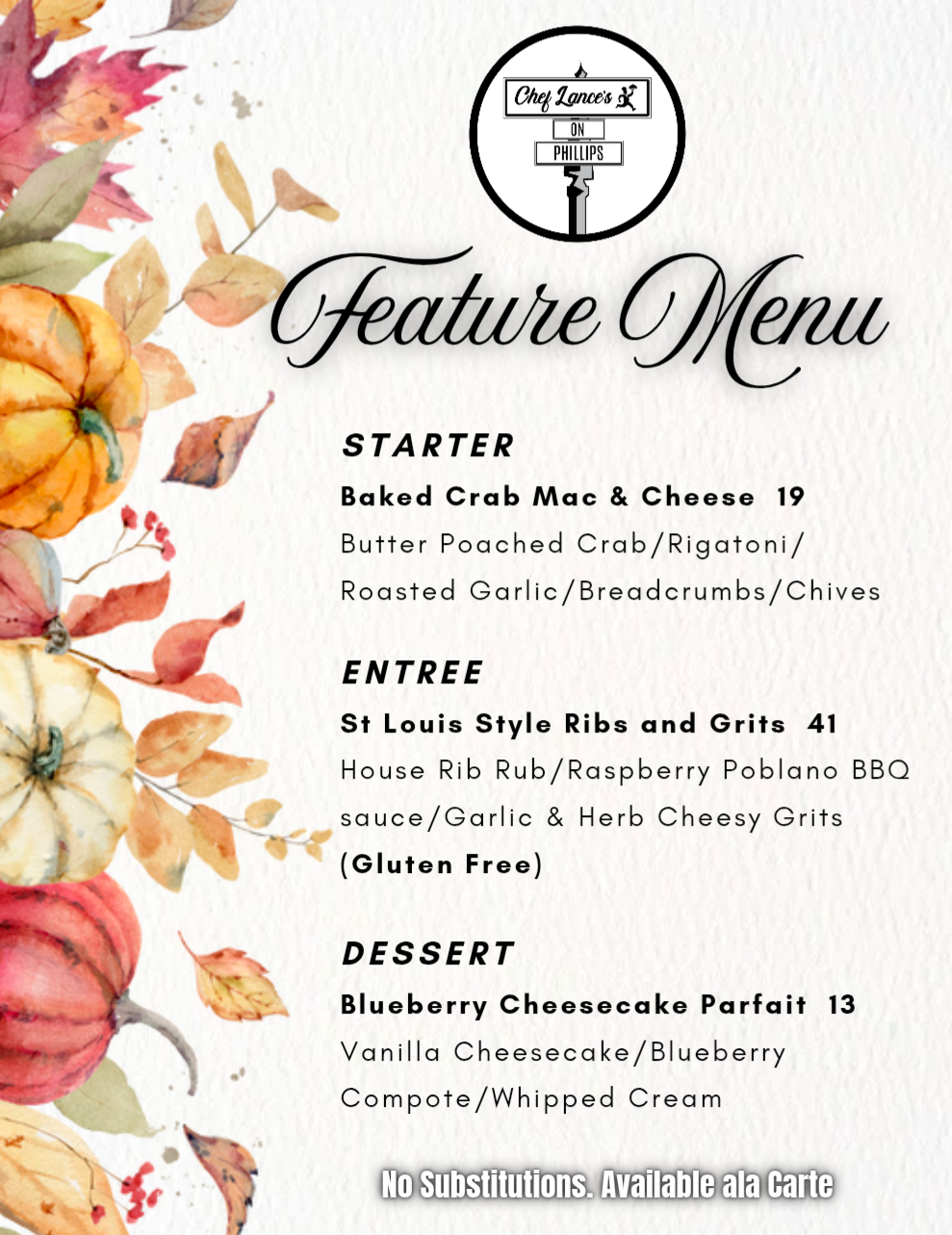 Our Feature Menu for November is available the entire month of November, in addition to our regular menu.
