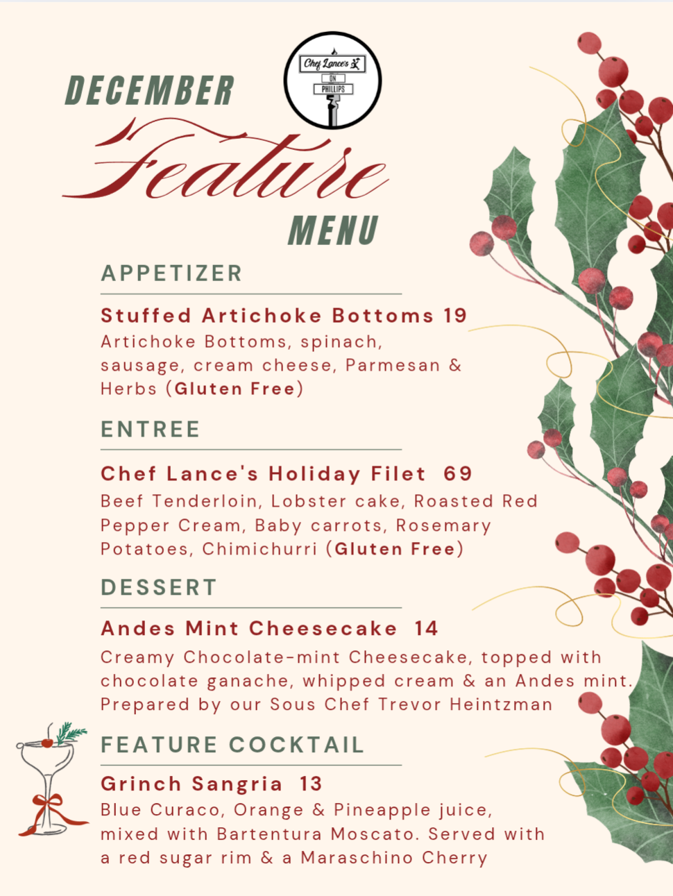 Our Feature Menu for December is available the entire month of December, in addition to our regular menu.