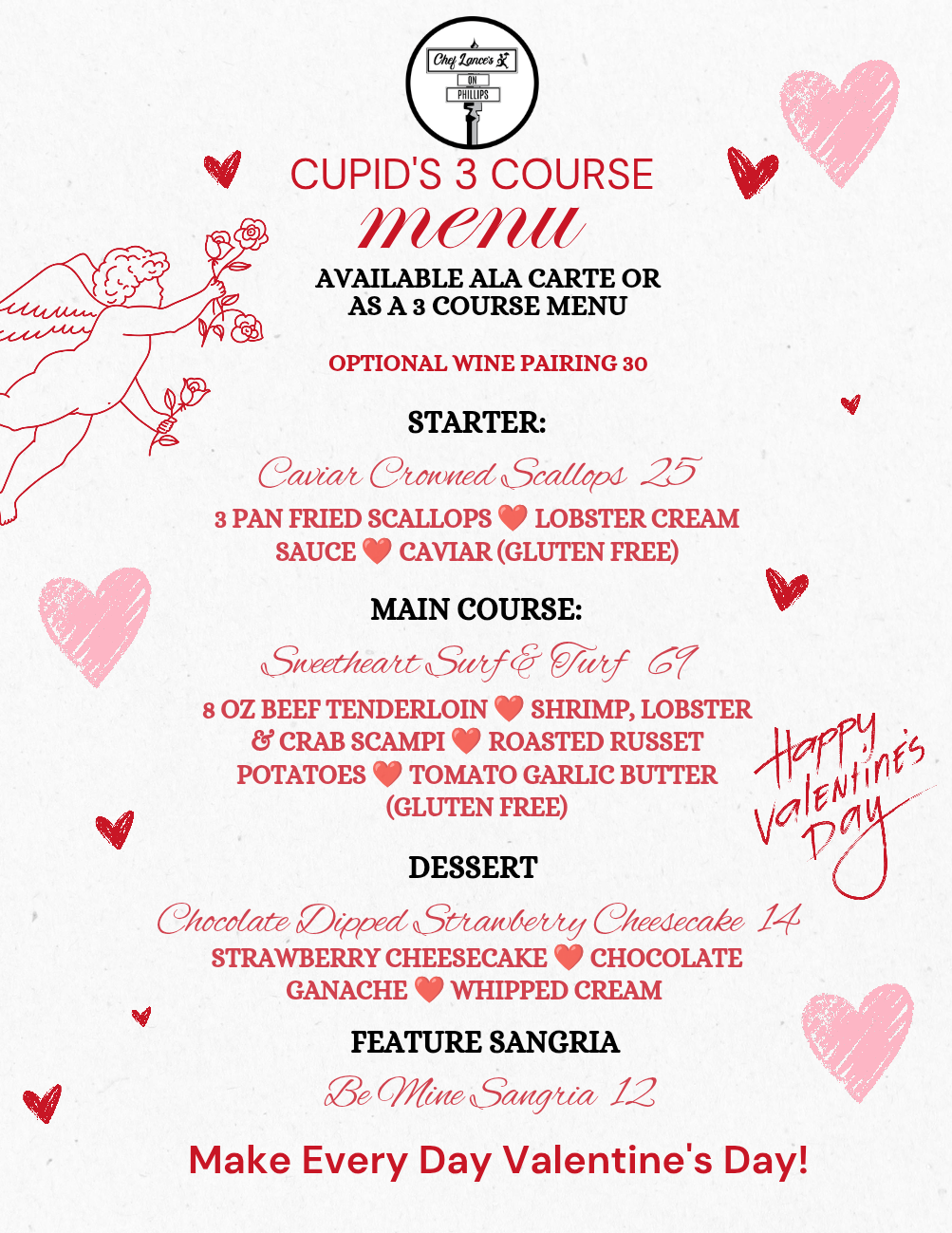 Make Every Day Valentine's Day with our Cupids 3 Course Menu in February. This special menu is available the entire month of February, in addition to our regular menu.